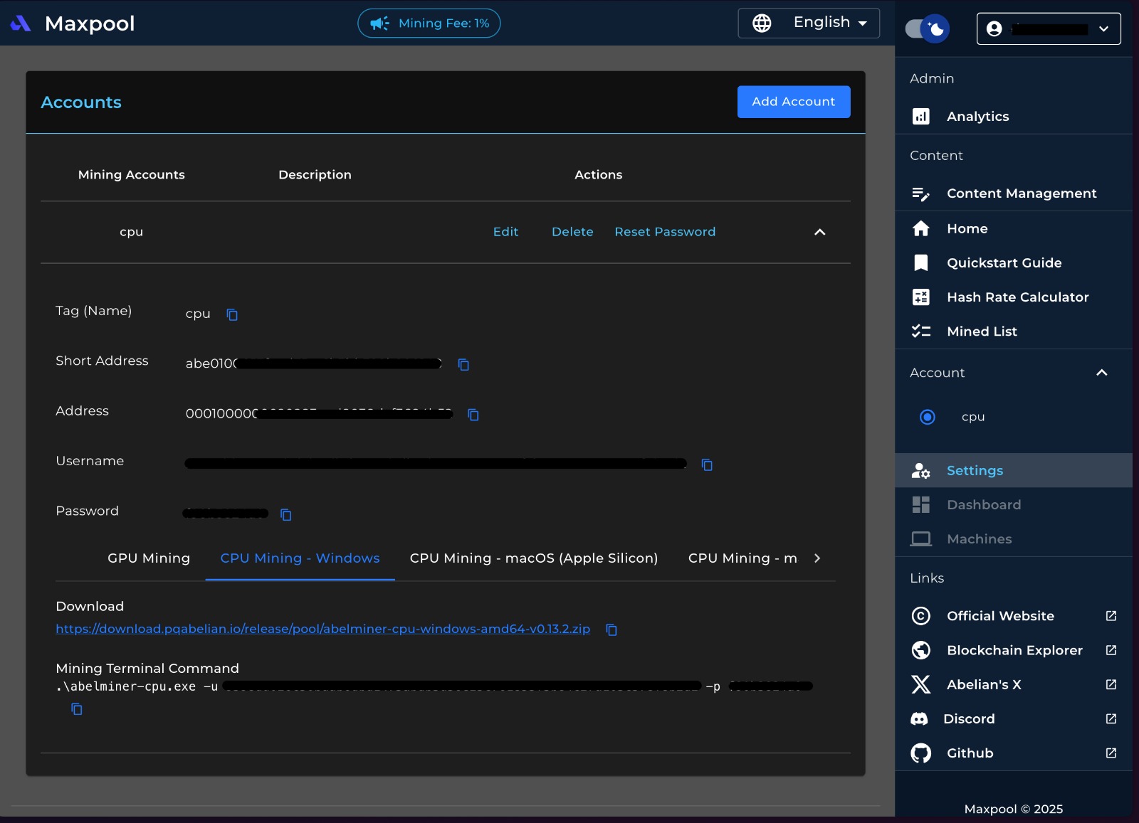 • Press the Add Account button to create a new mining account