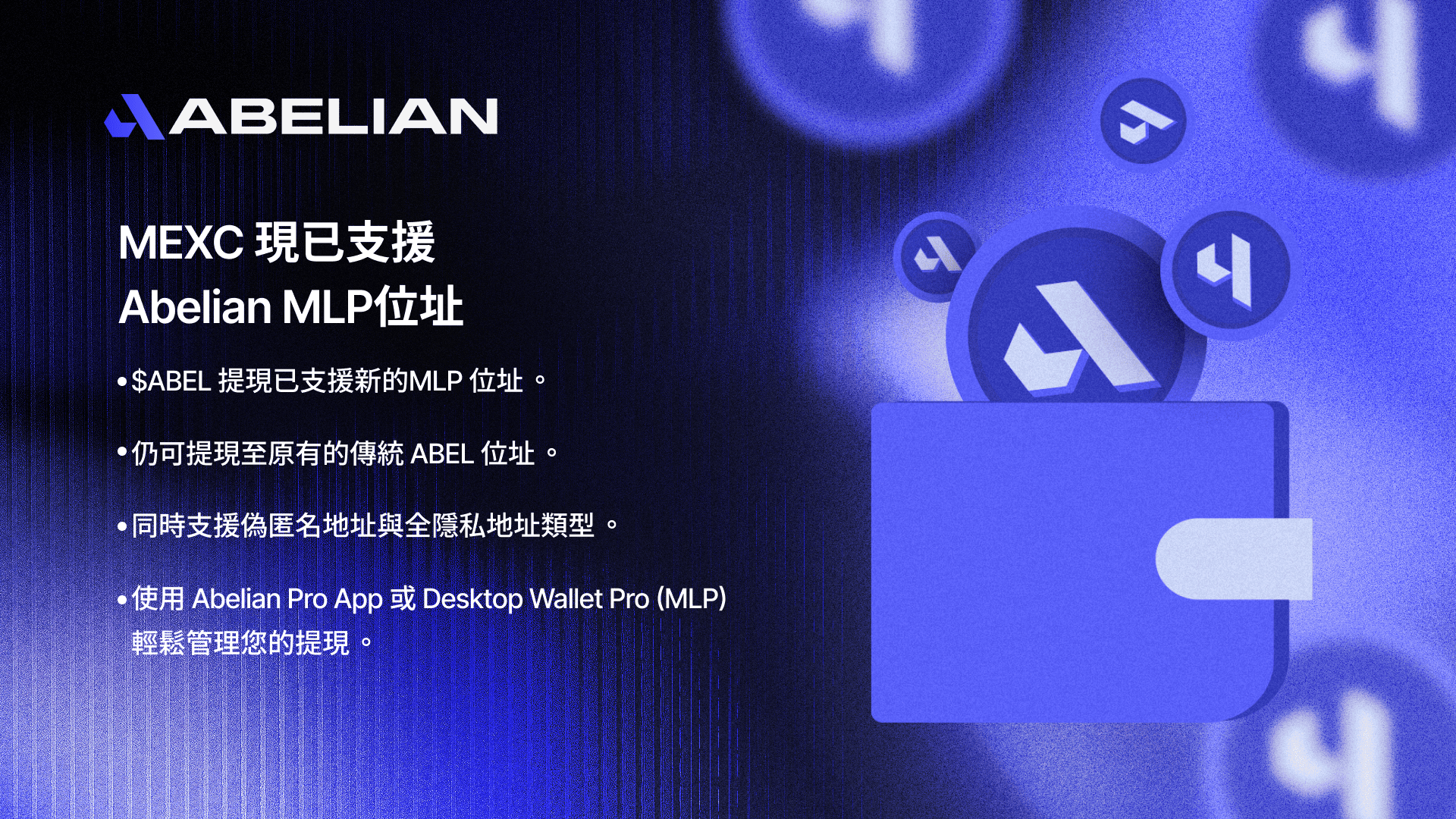 同時,Abelian 深化了與 MEXC 的基礎設施集成,實現了 $ABEL 直接提現至 Abelian 的多層隱私位址系統。此次升級為用戶帶來了立竿見影的實用優勢,使用戶能夠靈活選擇將資金提現至標準錢包(偽隱私MLP錢包)以便於日常使用,或提現至隱私錢包(全隱私型 MLP 錢包)以增強隱私保護;同時,Abelian 也完全支持原有地址。